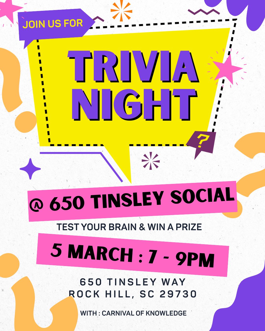 Come enjoy a few fun rounds of Trivia while sipping on your favorite drink or enjoying dinner with us. Great PRIZES to be won !